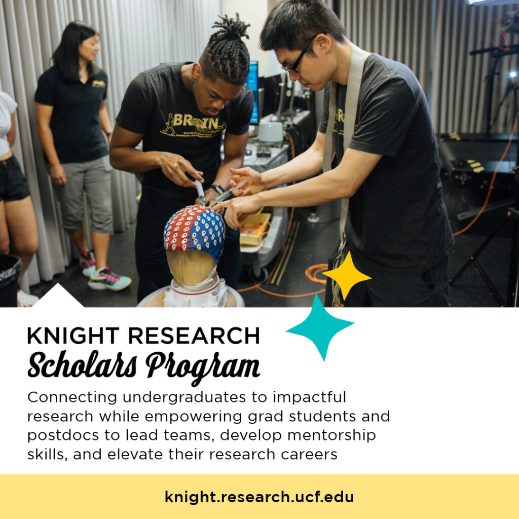 This past Spring, the offices of Graduate Student Life, Postdoctoral Affairs, Undergraduate Research, and Research Development launched a new initiative to foster interdisciplinary collaboration and expand research opportunities for the UCF community. The Knight Research Scholars Program (KRSP) connects undergraduate students to impactful projects and offers graduate students and postdoctoral scholars the opportunity to lead a team of undergraduates while advancing their own research.